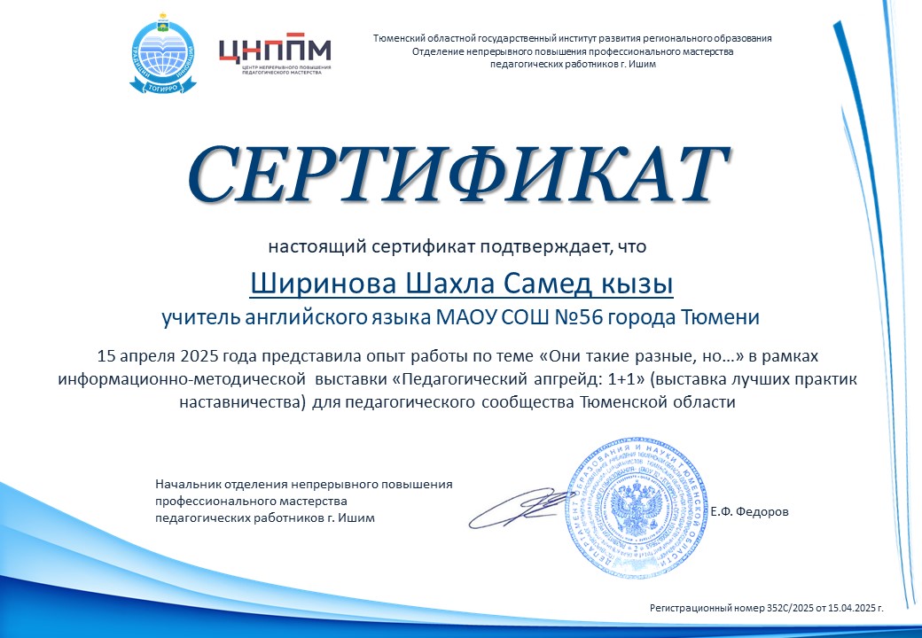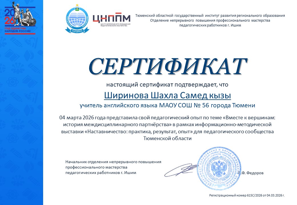 Представила свой педагогический опыт по теме «Вместе к вершинам: история междисциплинарного партнерства» в рамках информационно-методической выставки «Наставничество: практика, результат, опыт» для педагогического сообщества Тюменской области